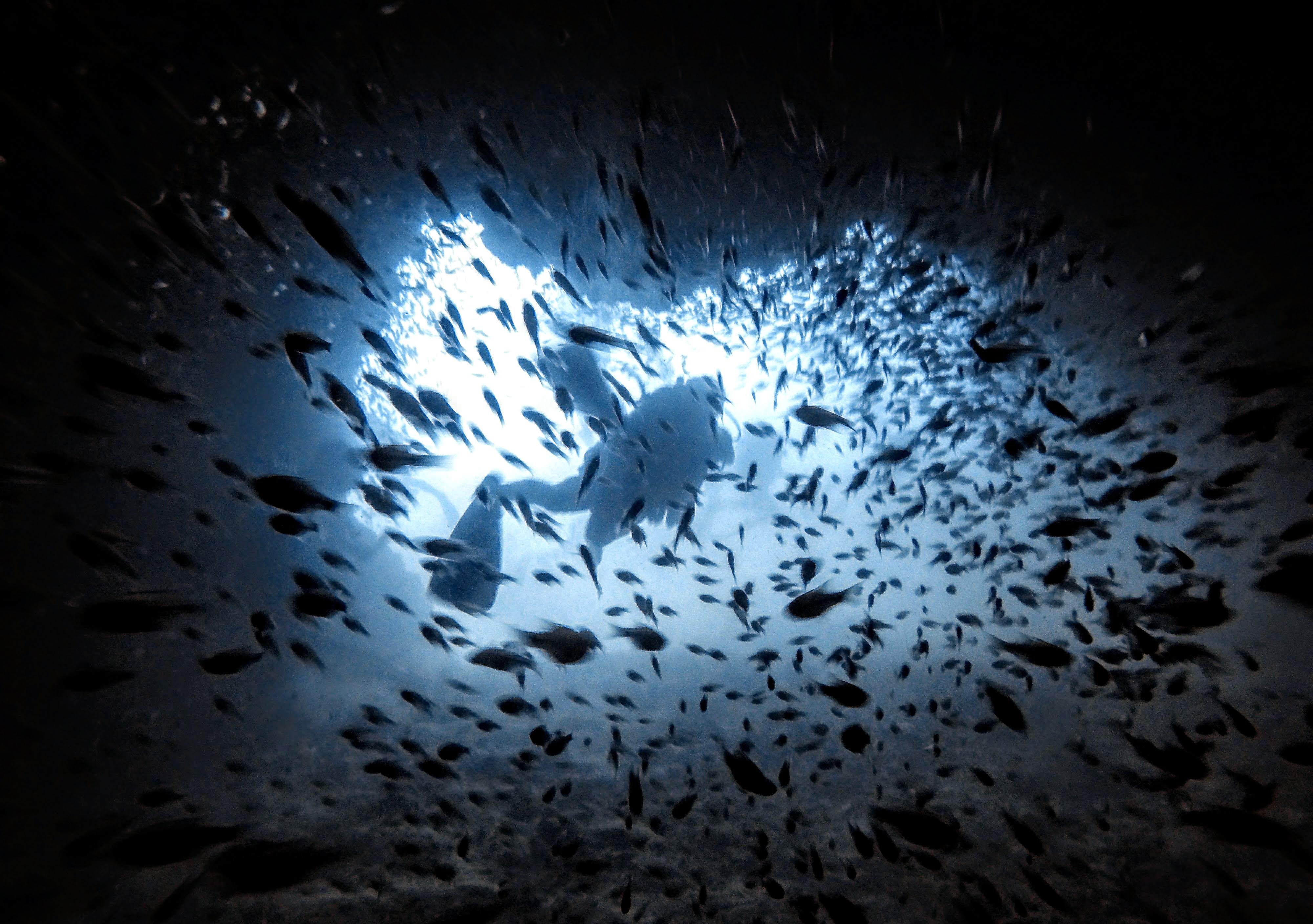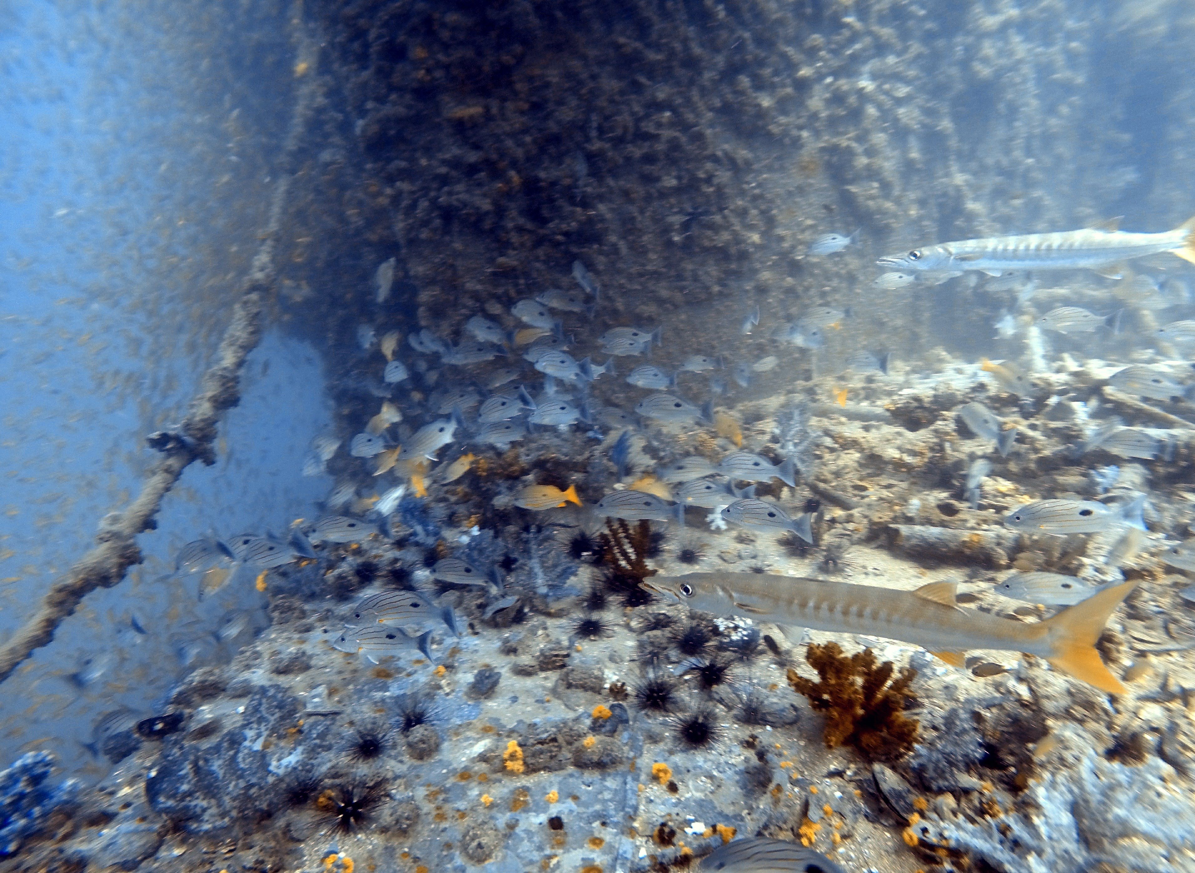 킹크루즈 난파선 포인트까지는 1시간 가량 배를 타고 이동하는데, 7월은 시야가 그리 좋지 않지만 거대한 난파선을 보금자리 삼은 물고기 떼가 가득합니다.