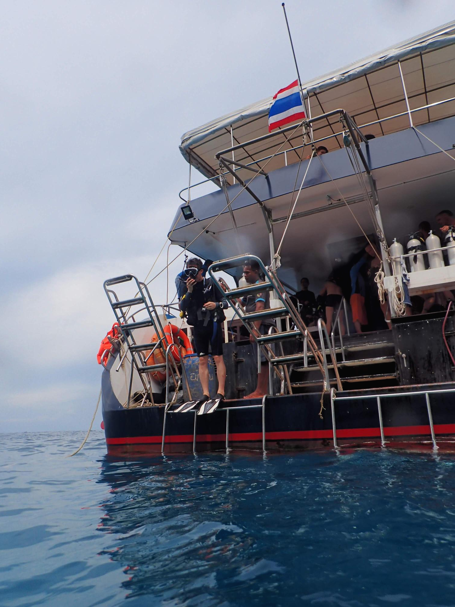 마찬가지로 찰롱 부두에서 가이드를 만나 배에 탑승하는데, 배 크기가 대부분 비슷하고 20여명의 다이버가 탑승하는데, 우리 앞에 출발하는 배는 사람들이 바글바글 하길래 가이드에게 물어보니 중국 사람들이 운영하는 배인데 스노클러도 포함해서 사람을 꽉꽉 채워 간단다.