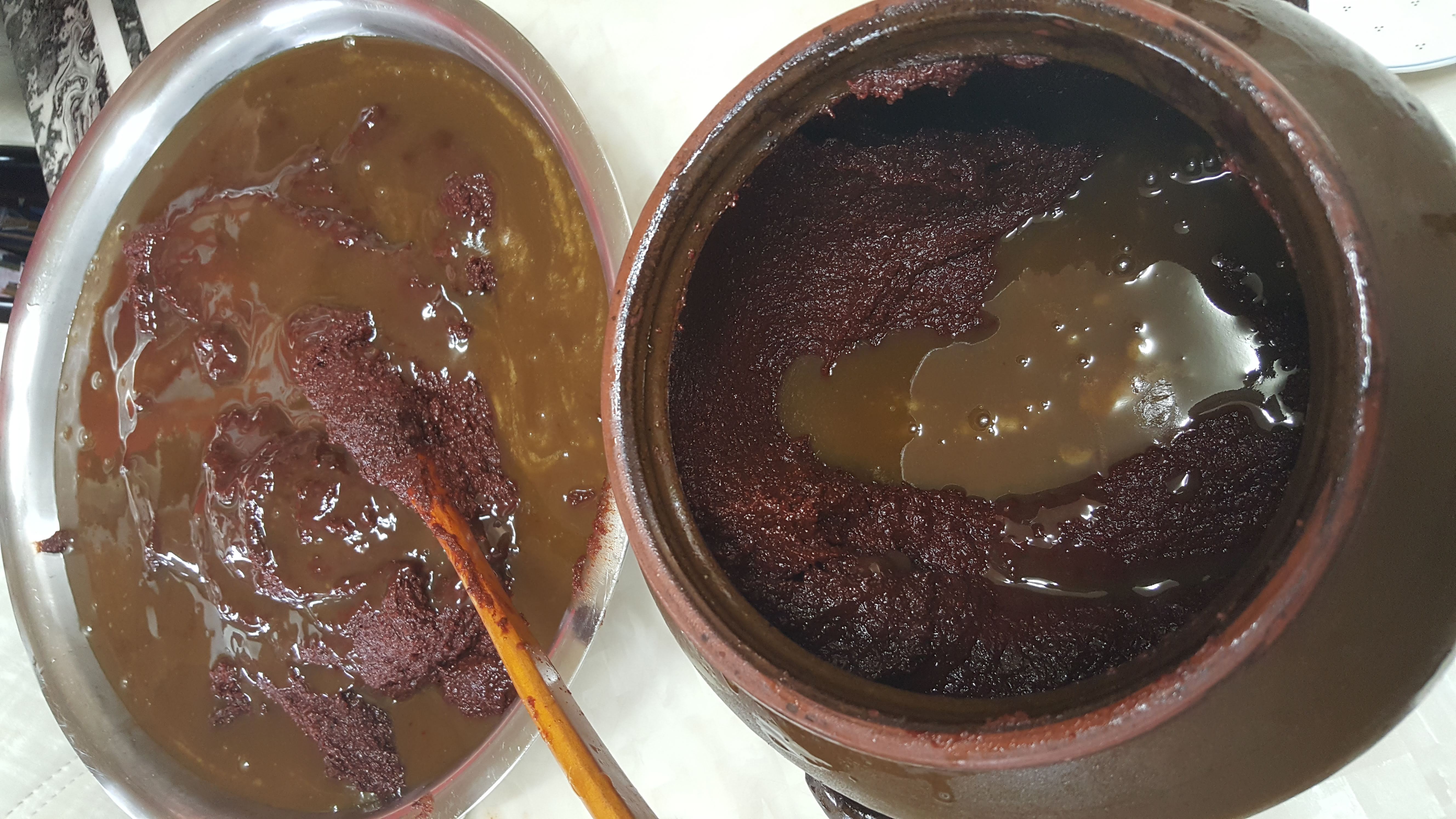 저녁에 고두밥을 짓고 엿기름과 섞어 삭혀놓았다가 아침 일찍 가마솥에 불을 지펴 5시간 넘게 달여 조청을 만들고, 메주가루, 죽염, 여름 내 키우고 말린 고추가루에 조청을 더해 재료, 시간, 정성으로 고추장을 완성합니다.