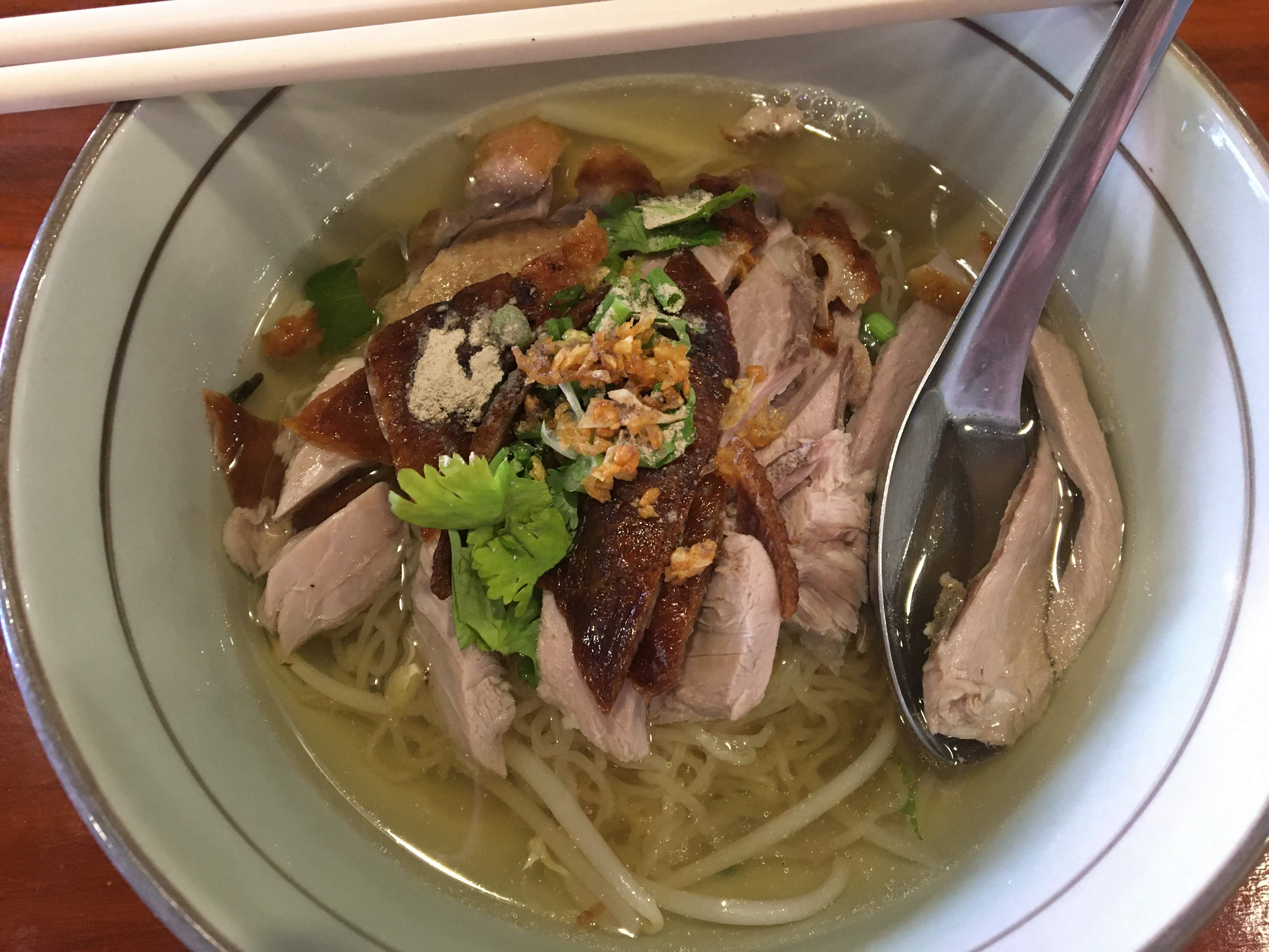 오리 국수집은 내공 있어 보이는 갈색톤의 인테리어가 고풍스러움을 내보이는데, 구운 오리를 밥, 국수(비빔과 국물 중 선택), 완탕 등에 올려서 내준다.