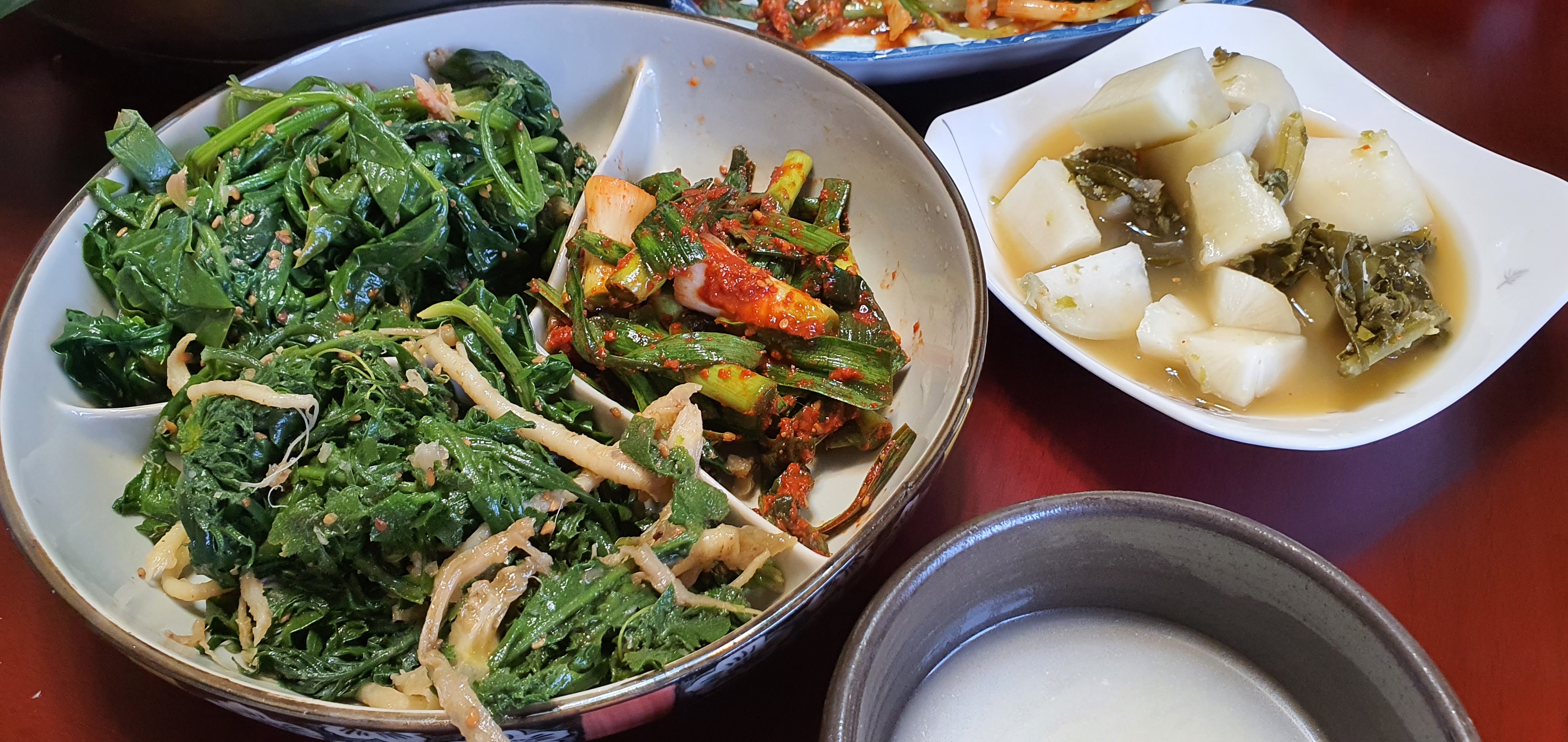 날이 춥고 눈이 쌓여도 겨울 밭에 초록을 유지하는 냉이, 풋마늘, 시금치! 나물과 김치로 이만한 막걸리 안주도 없다.