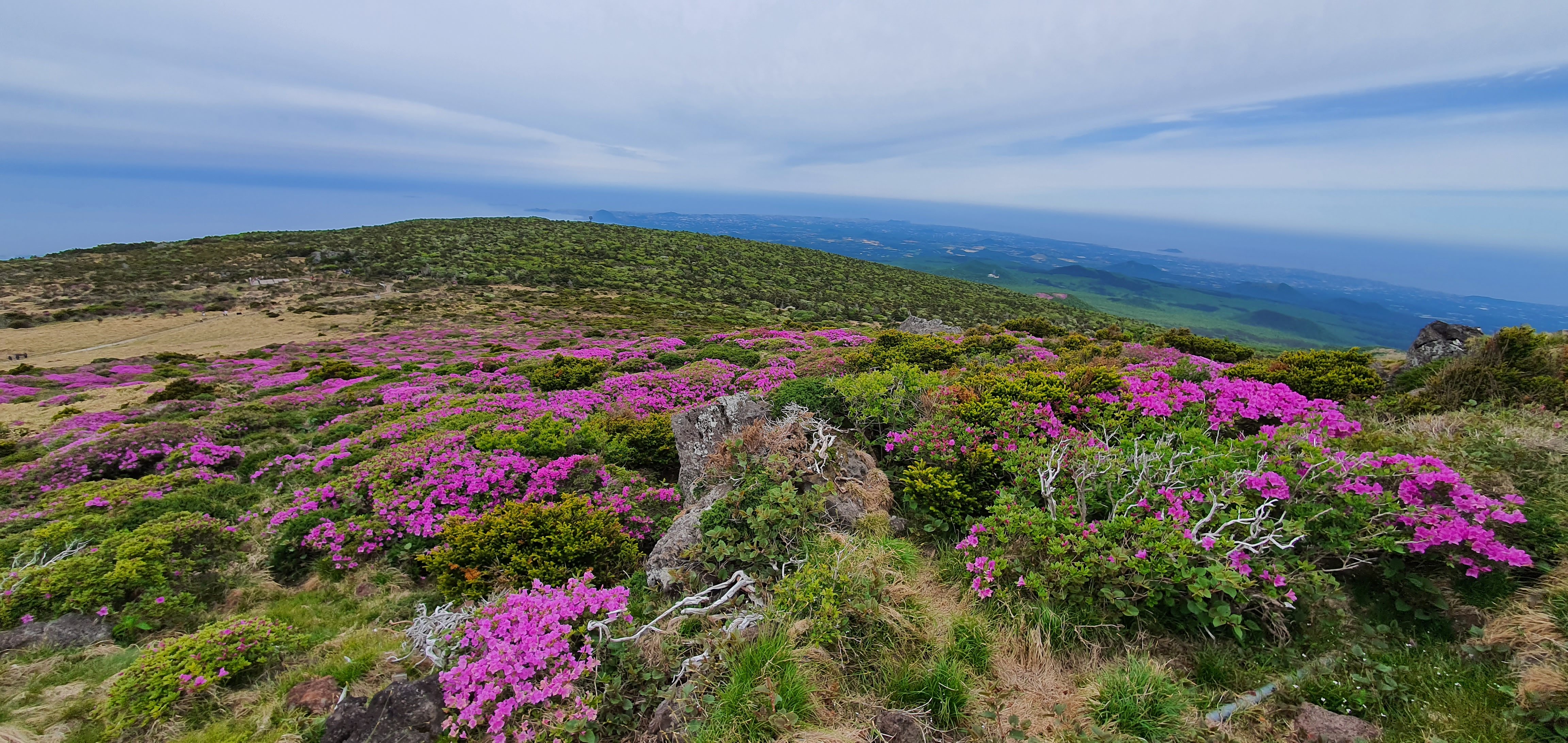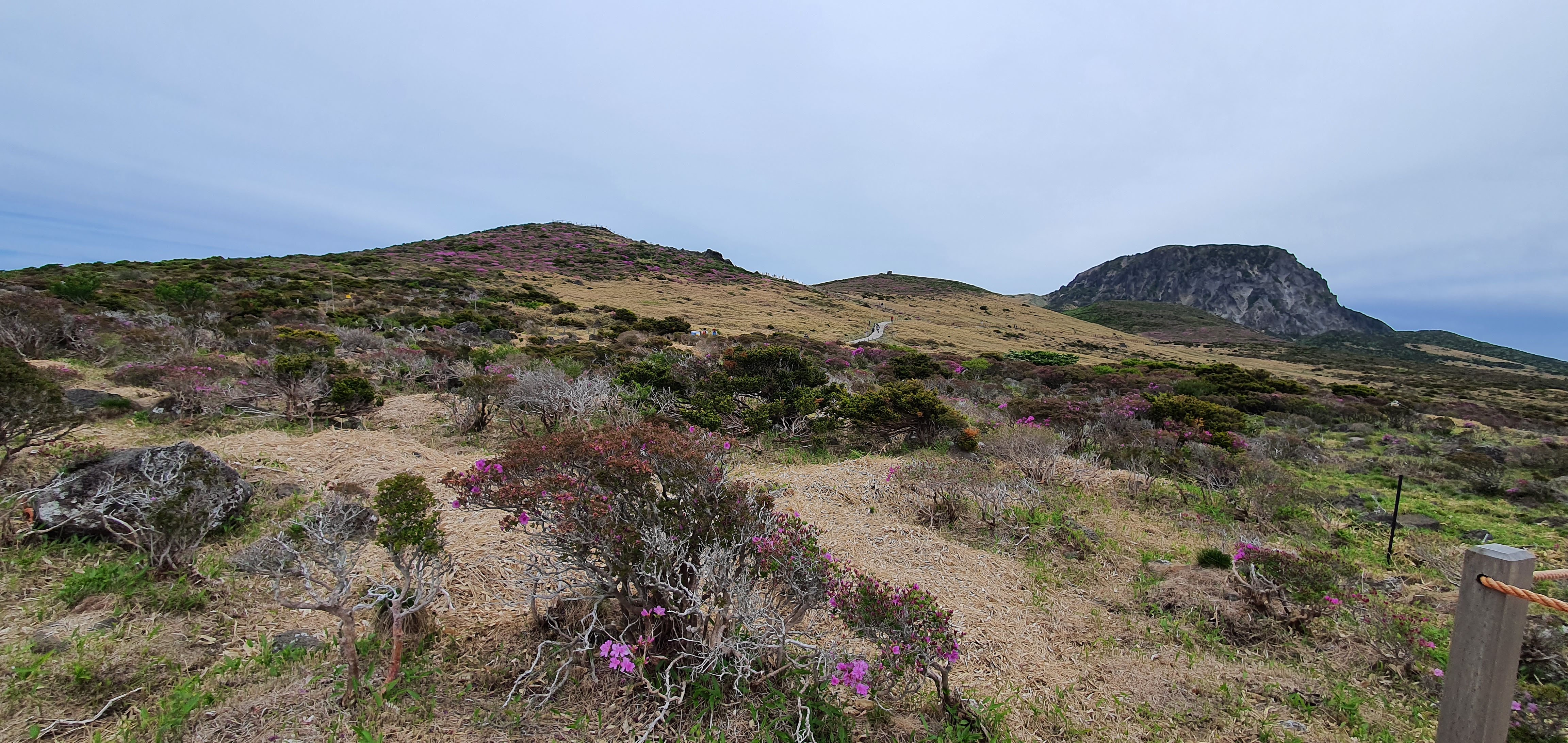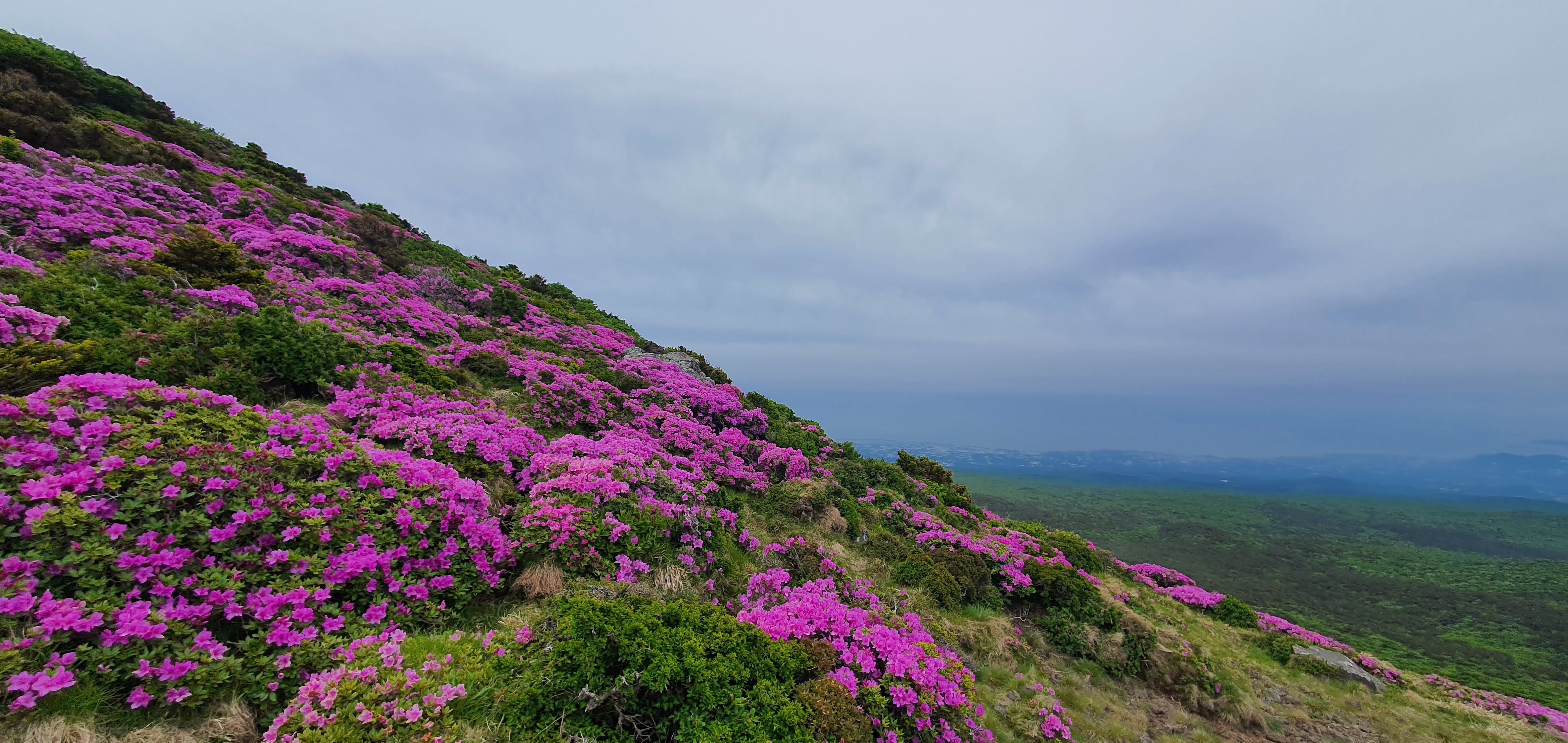 선작지왓은 조릿대가 장악했으나 1600M 평탄한 고지에 구불구불 탐방로와 철쭉, 남벽이 어우러진 풍경이 김종철의 <오름 나그네> 속 '늦봄, 진달래꽃 진분홍 바다의 넘실거림에 묻혀 앉으면 그만 미쳐 버리고 싶어진다.'다는 옛모습은 아니지만 충분히 즐길만하다.