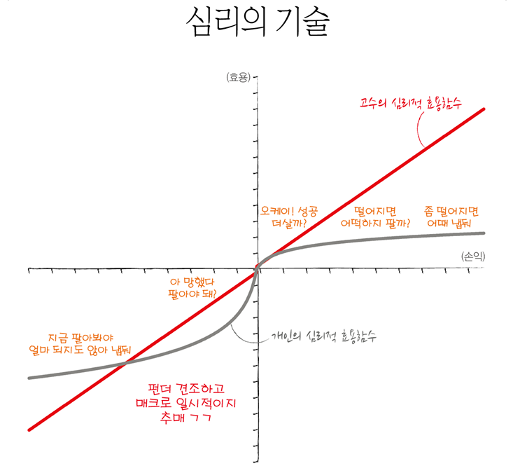 수익에 대한 심리적 효용은 체감하고 공포는 탐욕보다 2.5배 더 크다. 그래서 사람은 수익은 확정하고 싶어하고 손실의 공포를 느끼면서도 포지션을 방치한다. 수익이나 손실이 과도하게 커져서 무감각해지면 그때엔 위험한 투자를 감행한다.
