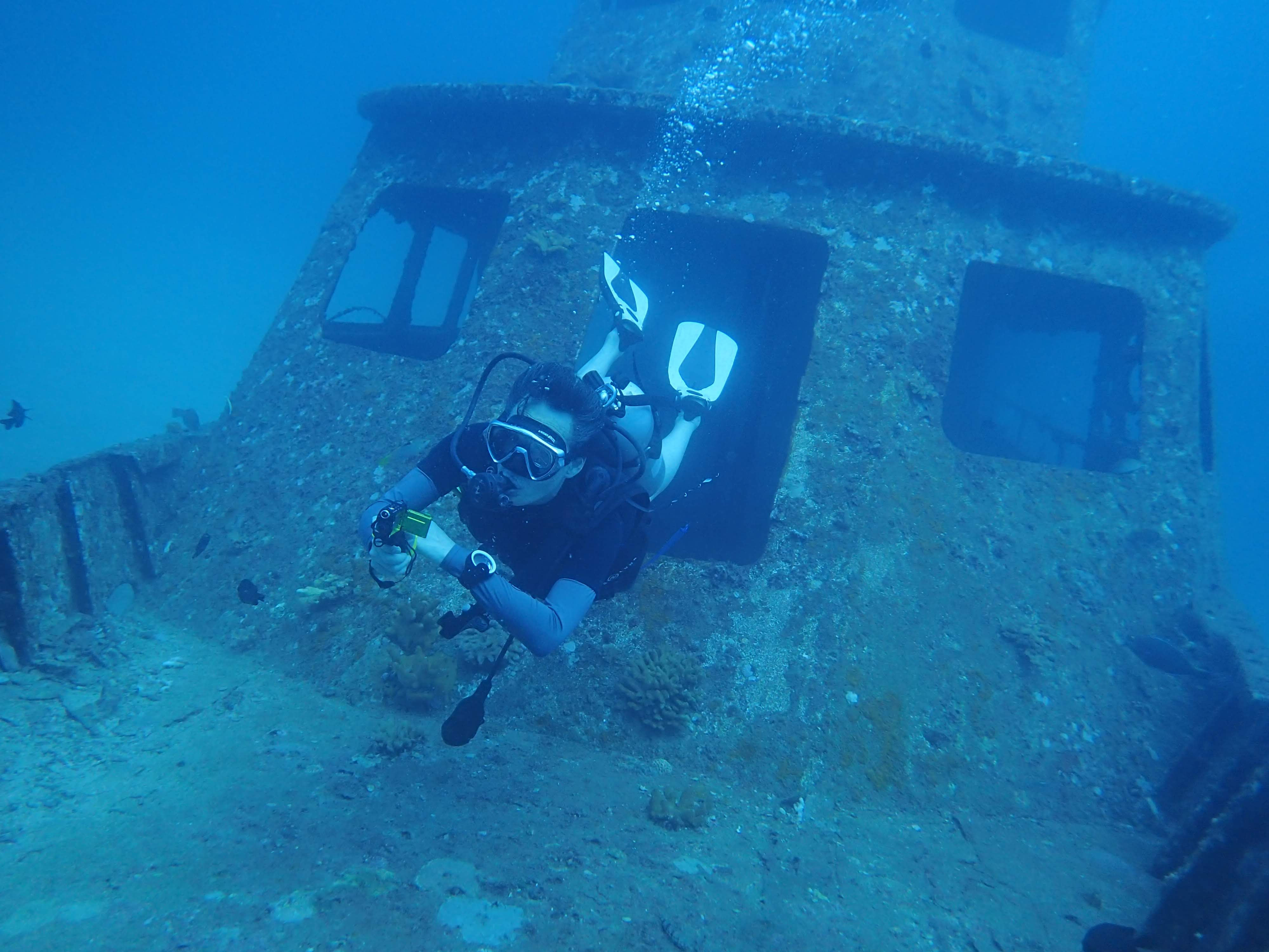 첫 번째 포인트는 Racha yai IS bay #1, 시야도 좋고 모래바닥 구조물 속에 모레이(곰치)를 비롯해 물고기들이 많고 조그만 난파선도 있다. 조류가 심해서 다이빙 시간은 짧게 끝내고 올라오니 수면에는 빗방울이 조금씩 내린다.